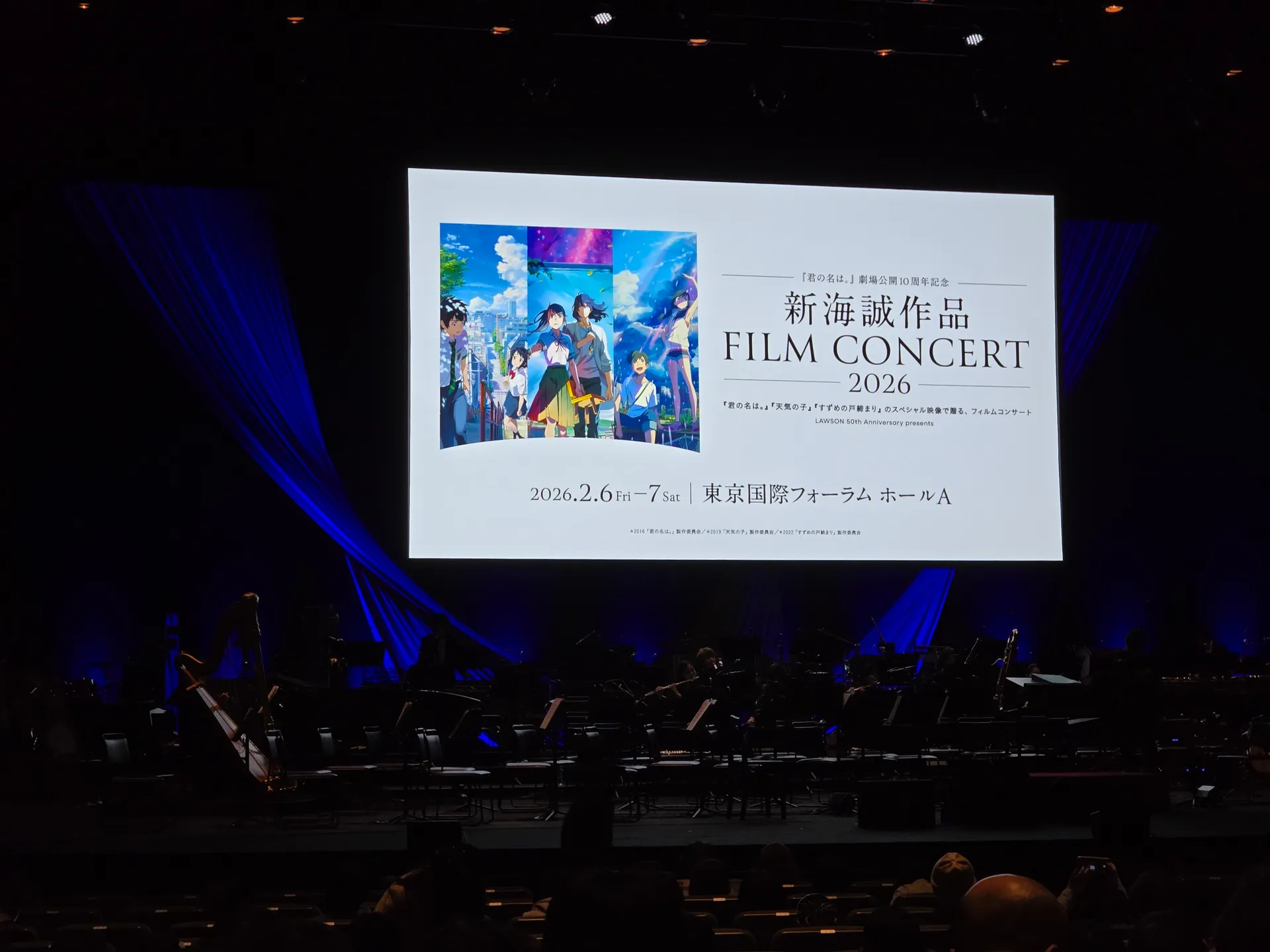 2026年2月7日,天气阴有时有小雪。今天去位于东京国际会议中心 A厅听《新海诚作品视听交响音乐会 2026》。 已经很久没有在东京都内聆听音乐会了。自从日本物价持续上涨,动漫、游戏音乐相关的演出也更多选择在东京周边城市举办。更何况,这次音乐会竟然选址在音响与灯光效果都极为出色的东京国际会议中心,本身就显得相当难得。 由此也不难看出,这确实是一场依托于高人气作品才能实现规格与阵容的音乐会。