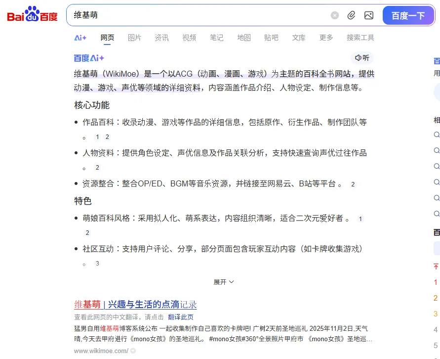 百度又可以搜到维基萌了。