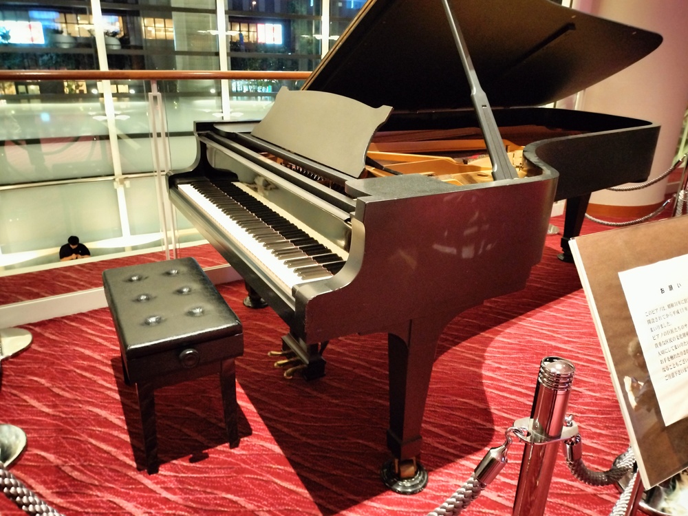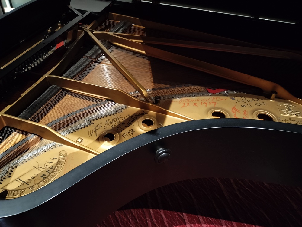 大厅摆放的钢琴,里面有不少音乐名人的签名。