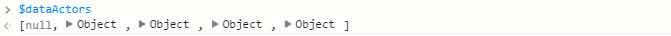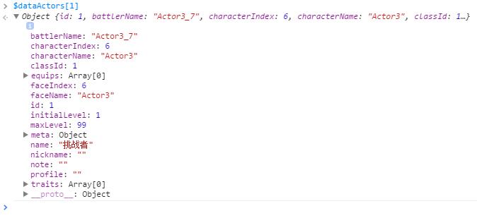 $dataActors的长度为5,第一个元素为null,其他四个为Object。那么我们输入$dataActors[1] 来获取第一个Object。