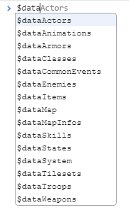 游戏中经常使用的变量,会以$data开头。其作为游戏基本的数据,会通过RPG Maker MV自动生成,data文件以*.json的形式保存。这些文件会在游戏开始时读取,基本上是不会发生变更的静态数据,本指导中会将这些称之为「$data变量」,被保存的值则称为「静态数据」。